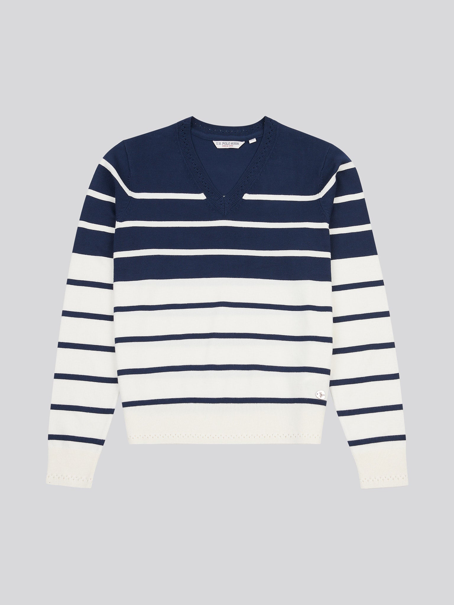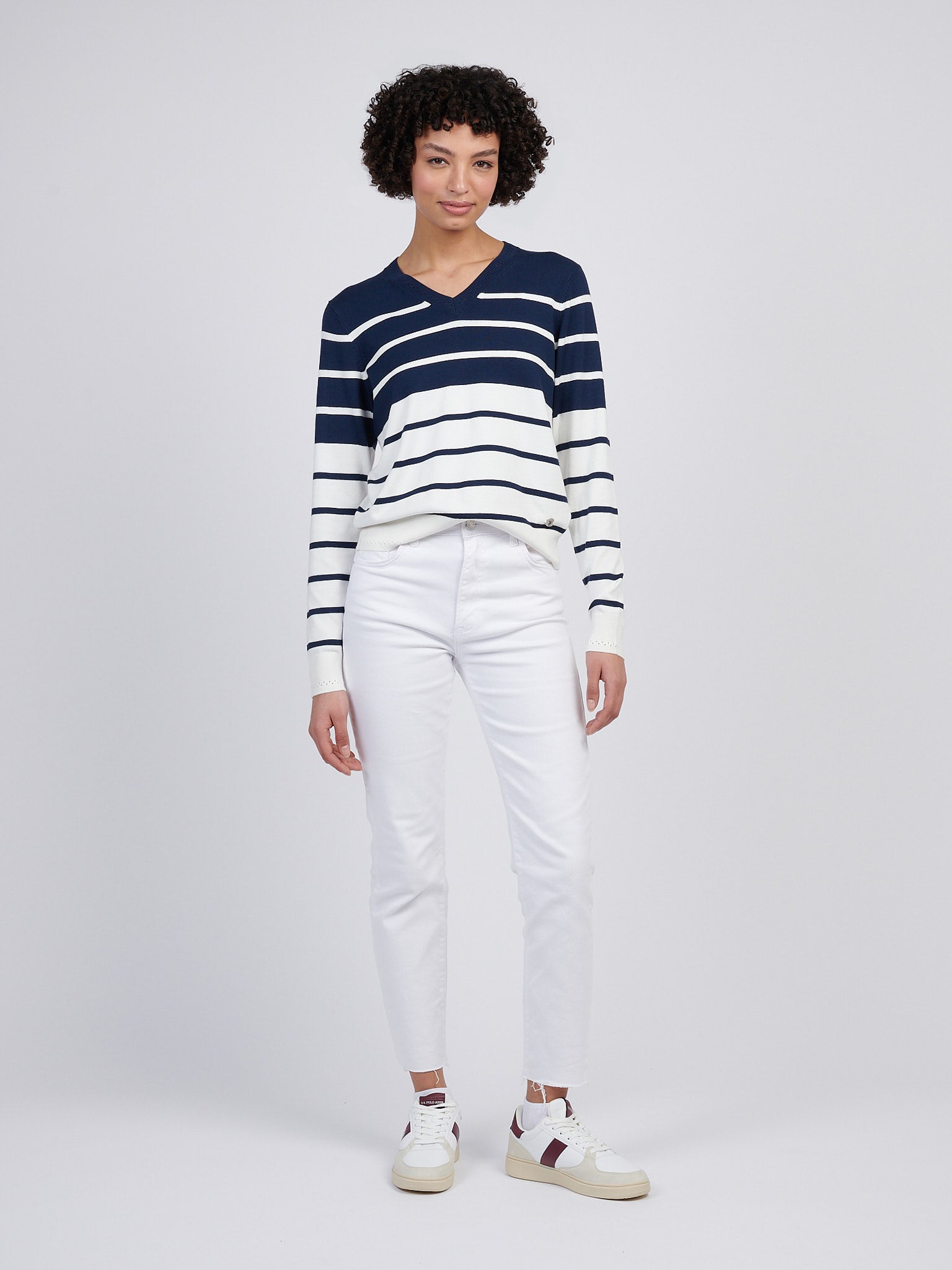 Womens Stripe V-Neck Fine Knit Jumper in Navy Iris