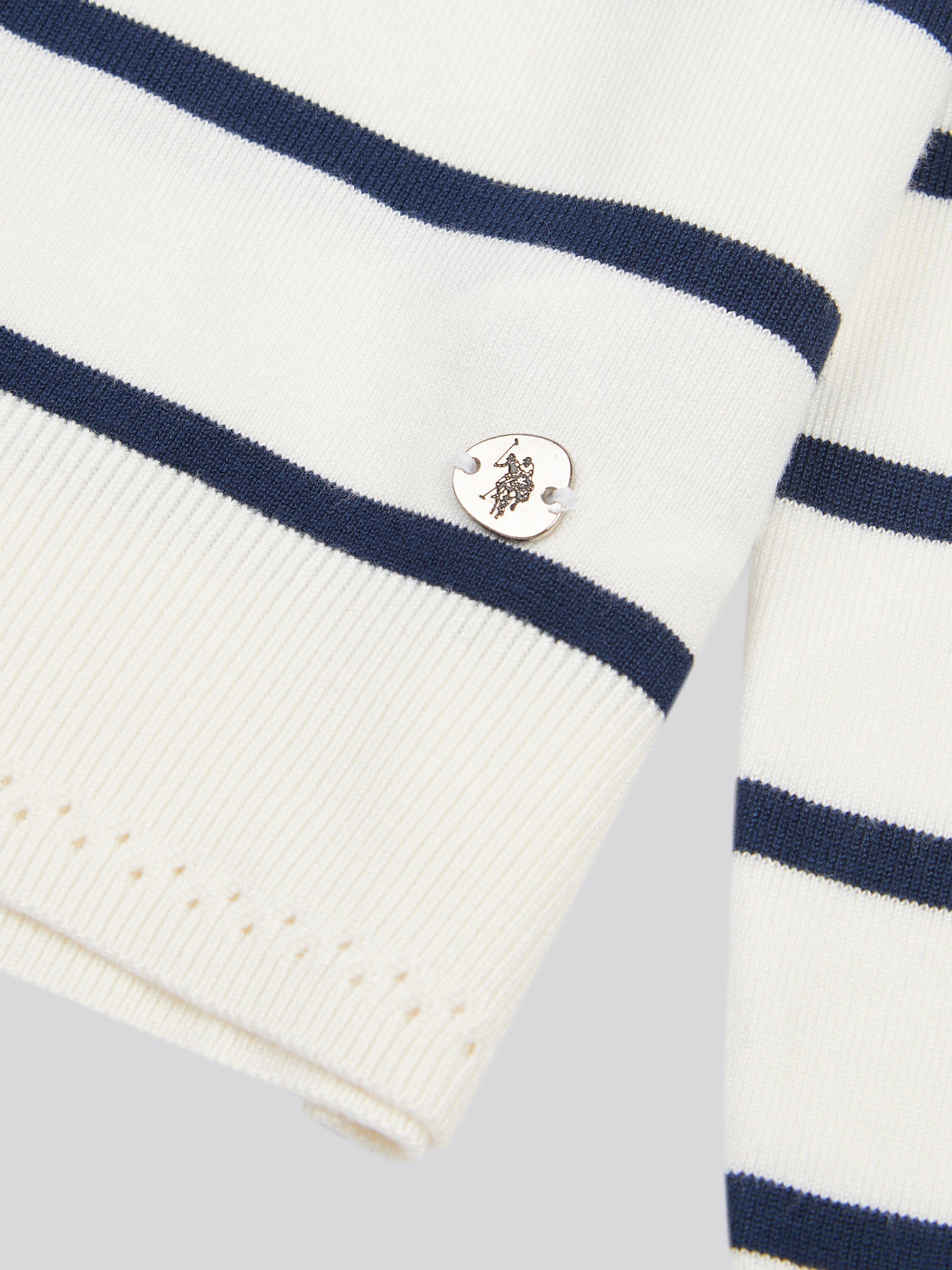 Elevate your wardrobe with the U.S. Polo Assn. Womens Stripe V-Neck Fine Knit Jumper in Navy Iris—a refined knit designed for women who value subtle sophistication in their office wear and casual office clothing. This piece shines when layered over tailored trousers or styled casually with jeans, making it a versatile staple for busy workdays.
